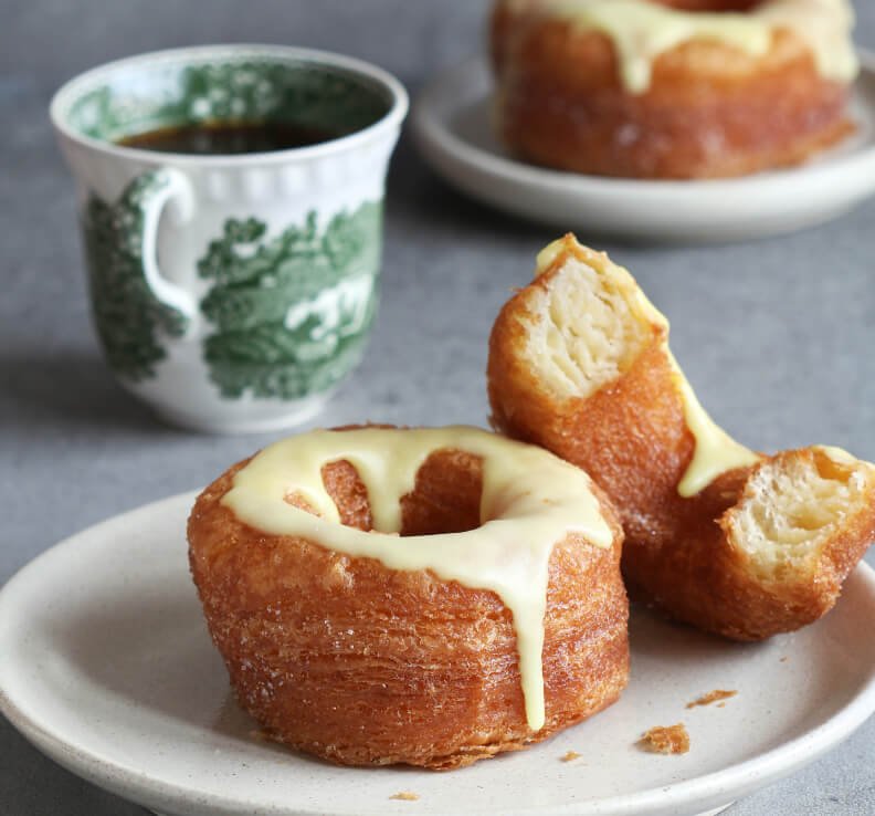 The croissant dough is laminated, cut into a doughnut shape and fried until crisp and golden. The butter provides a delightful flaky texture.