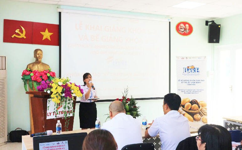 Tại buổi lễ trao bằng tốt nghiệp, Bà Kiều Thị Hòa Lan – Trưởng phòng nhân sự công ty Saf-Việt đã có bài phát biểu tuyên dương tinh thần học hỏi phấn đấu của các anh chị học viên. Tham gia khóa học, học viên được trang bị kiến thức, kỹ năng cơ bản về nghề bánh, giúp nâng cao khả năng nắm bắt cơ hội việc làm với nghề bánh. Ngoài ra, Bà cũng cảm ơn sự quan tâm hỗ trợ của nhà trường cũng như dự án BAKE đã tạo điều kiện để các bạn có môi trường học tập thật tốt.